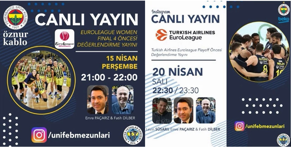 Yayınlarımızdan ilkini 15.04.2021 tarihinde gerçekleştirdik ve Eurolegue Women Organizasyonunda başarılı bir sezon geçirerek Final Four’a kalan Fenerbahçe Öznur Kablo Kadın Basketbol Takımı’mızın final maçları öncesi durumunu Yönetim Kurulu Üyelerimiz Emre Paçarız moderotörlüğünde Fatih Dilber ile birlikte değerlendirdik.